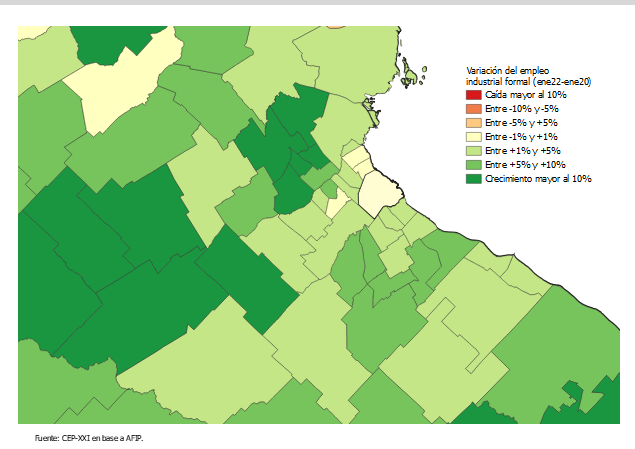 “Casi todos los partidos del Gran Buenos Aires tienen más empleo industrial que antes de la pandemia. El repunte fue particularmente alto en el cordón noroeste (Pilar, Escobar, Malvinas Argentinas, José C. Paz y Moreno)”