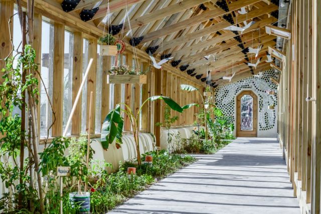 La escuela se autoabastece por completo, se recolecta el agua de la lluvia en tanques gigantes, pasando luego por un sistema de filtrado, para usar en los baños, el riego del invernadero y la huerta. Además, posee paneles fotovoltaicos que brindan toda la energía eléctrica necesaria y también en este espacio se producen alimentos orgánicos.