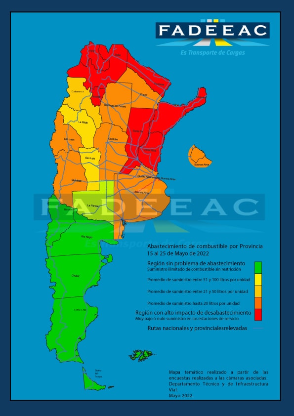 El pasado lunes, la Federación Argentina de Entidades Empresarias del Autotransporte de Cargas (Fadeeac) dio a conocer un mapa del desabastecimiento de combustible, en el que se muestra en rojo a ocho provincias que atraviesan una situación grave por la falta de gasoil, con “muy bajo o nulo” suministro. Se trata de Jujuy, Salta, Formosa, Tucumán, Misiones, Corrientes, Santa Fe y Entre Ríos.