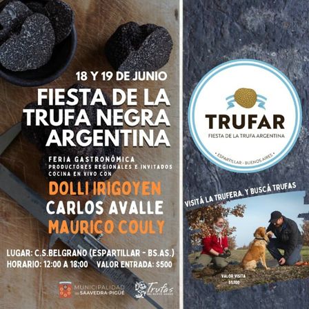 Sucederá el sábado 18 y domingo 19, de 12 a 18 horas, en la escuela primaria de Espartillar y en el Club Deportivo Belgrano. La fiesta constará de un ciclo de charlas de reconocidos cocineros que enseñarán el uso de la trufa en la gastronomía, se presentarán productores de trufa regionales y de otras provincias del país. Además se realizará una “búsqueda de trufas”, un tour por la trufera local y habrá feria de comidas y artesanías.