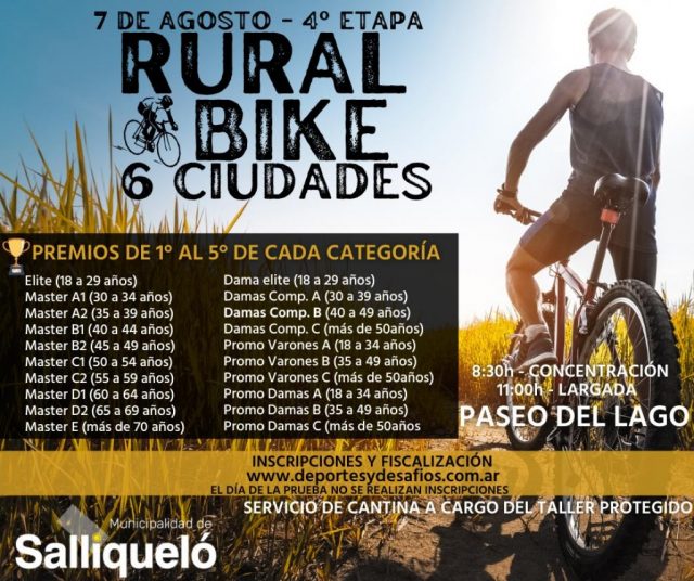 El próximo domingo 7 de agosto se correrá en Salliqueló la cuarta etapa del Rural Bike “6 Ciudades”, que entregará premios del Primero al Quinto Puesto de cada categoría.
