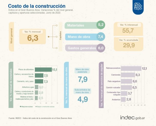 El Instituto Nacional de Estadística y Censos (Indec) informó que el índice de precios mayoristas subió 4,8% en junio y el costo de la construcción avanzó 6,3% en igual período. De esta manera, durante el primer semestre de 2022 los precios mayoristas acumularon un incremento de 34,9%, mientras que el costo de la construcción se incrementó 29,9%.