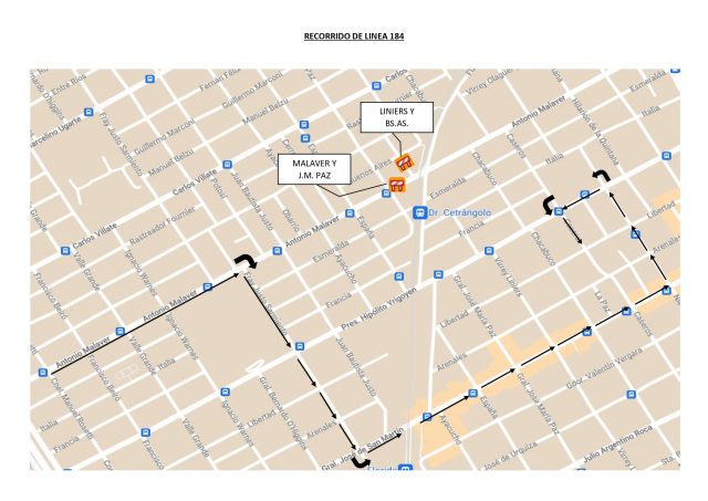El colectivo de la línea 184 tendrá, durante las obras, el siguiente recorrido: desde Malaver doblará en Sarmiento hasta San Martín; luego tomará por Avellaneda, Yrigoyen y en Caseros retomará su recorrido habitual.