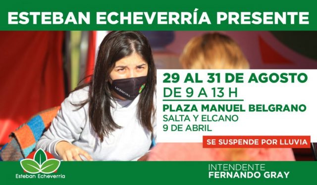 Del 29 al 31 de agosto, el Municipio realizará un nuevo operativo del programa ‘Esteban Echeverría Presente’ en la plaza General Belgrano (Salta y Elcano, 9 de Abril), de 9 a 13 horas, destinado a descentralizar la atención y facilitar a las vecinas y a los vecinos la realización de trámites. Allí funcionará la feria del Mercado Popular, donde se podrán adquirir productos como carnes, pastas y lácteos.
