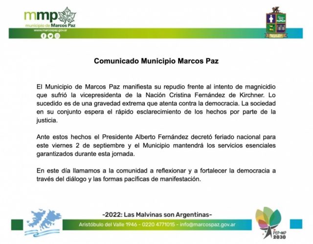 El Municipio de la localidad bonaerense de Marcos Paz manifestó su repudio frente al intento de magnicidio que sufrió la vicepresidenta de la Nación, Cristina Fernández de Kirchner.