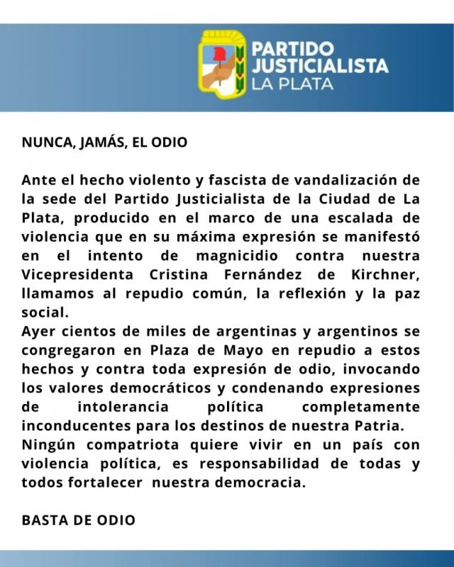 En un comunicado, el PJ platense indicó que “ante el hecho violento y fascista de vandalización de la sede del partido justicialista de la ciudad de La Plata, producido en el marco de una escalada de violencia que en su máxima expresión se manifestó en el intento de magnicidio contra nuestra vicepresidenta Cristina Fernández de Kirchner, llamamos al repudio común, la reflexión y la paz social”.