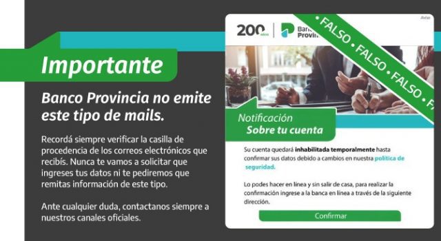 El Banco de la Provincia de Buenos Aires alertó a sus clientes por la posible recepción de mails en los que se solicitan datos y que pueden derivar en estafas.