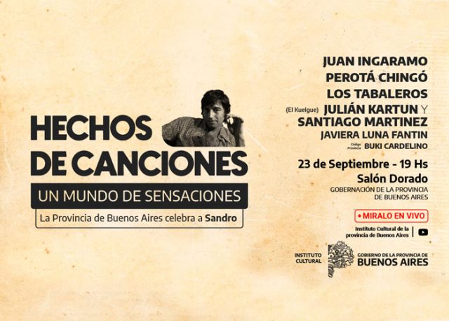 El Instituto Cultural de la Provincia de Buenos Aires homenajeará con un concierto a Roberto Sánchez, Sandro, en el marco del ciclo “Hecho de canciones”. Bajo el lema “Un mundo de sensaciones”, se trazará un recorrido por su figura.