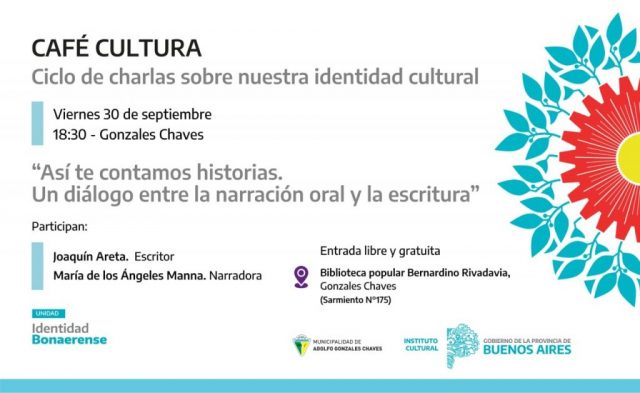 El Área de Cultura del Municipio de Adolfo Gonzáles Cháves informa que el 30 de septiembre se realizará un encuentro del ciclo de charlas y debates “Café Cultura” bajo la temática “Así te contamos historias. Un diálogo entre la narración oral y la escritura.”