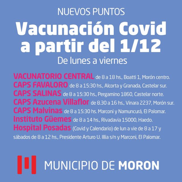 Atento a esto, y a la suba de casos que se vienen registrando en las últimas semanas, el Municipio de Morón suma desde el 1 de diciembre nuevos centros de vacunación contra el covid-19.