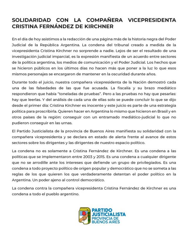 El Partido Justicialista de la provincia de Buenos Aires se solidarizó con la vicepresidenta Cristina Fernández de Kirchner y consideró que la condena del Tribunal Oral Federal n°2 “es una condena a todo el pueblo argentino”.