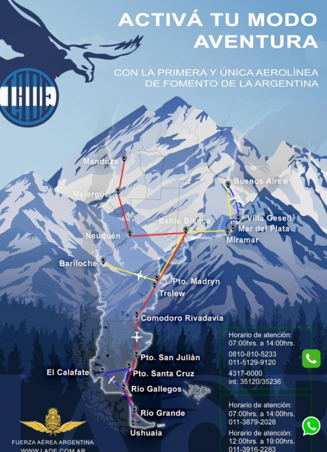 LADE es una aerolínea estatal de fomento dedicada al transporte de pasajeros, carga y correo que depende de la Fuerza Aérea y el Ministerio de Defensa. Actualmente, presta servicios regulares a Comodoro Rivadavia, Rio Gallegos, Río Grande, Ushuaia, Puerto Madryn, Bahía Blanca, Neuquén, Malargüe y Mendoza. Además, se realizan los siguientes vuelos quincenales a Mar del Plata, Bahía Blanca, Bariloche, Puerto Madryn. También opera vuelos charter a Santa Rosa de Conlara y Villa Reynolds.