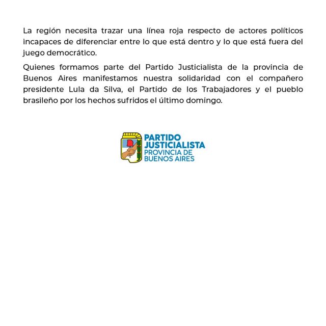 El Partido Justicialista de la provincia de Buenos Aires emitió un comunicado en el que expresó su “repudio” al intento de golpe de Estado en Brasil cometido por seguidores del expresidente Jair Bolsonaro contra el gobierno “legítimo y democrático” de Luiz Inácio Lula da Silva y afirmó que se debe “gobernar para las mayorías silenciosas con justicia social, soberanía política e independencia económica”.