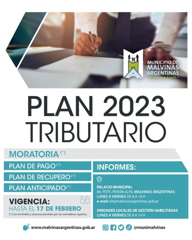 El municipio de Malvinas Argentinas ya puso en vigencia el Plan Tributario 2023, el cual se extiende hasta el día 17 de febrero inclusive y tiene importantes beneficios para los vecinos que accedan a cualquiera de sus tres modalidades: pago anual, plan de pago y recupero de caídos.