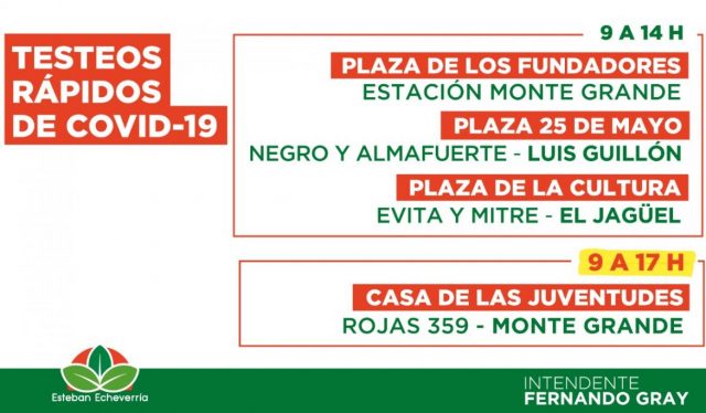 El sábado 28 de enero, el Municipio de Esteban Echeverría dispondrá cuatro puntos de testeo de COVID-19 en las localidades de Monte Grande, Luis Guillón y El Jagüel, a los cuales las vecinas y los vecinos podrán acceder de manera gratuita y sin turno previo.