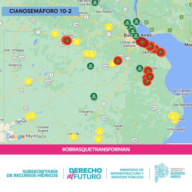 Por último, se mantiene el alerta naranja por presencia de cianobacterias en la Laguna de Gómez (Puente Lincoln) en Junín; Laguna de Lobos, de ese distrito; como también en la Laguna Chis Chis, La Tablilla y las Barrancas, espejos de agua de la cuenca del río Salado, en el centro norte de la provincia.
