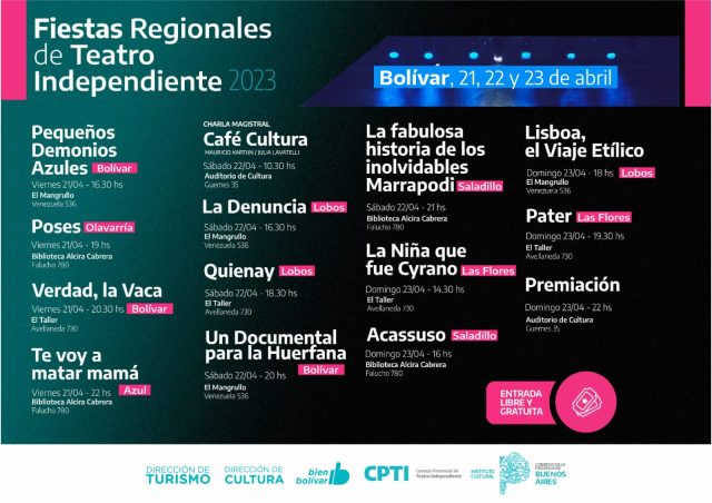 La Municipalidad de Bolívar, junto al Consejo Provincial de Teatro Independiente (CPTI) del Instituto Cultural de la Provincia de Buenos Aires, invitan a la Fiesta Regional del Teatro Independiente que se desarrollará en la ciudad.