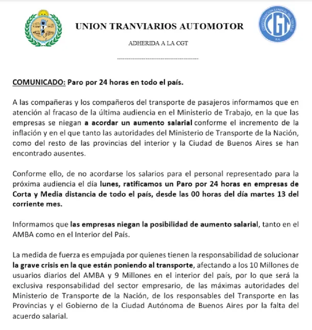 “Las empresas se niegan a acordar un aumento salarial conforme el incremento de la inflación y en el que tanto las autoridades del Ministerio de Transporte de la Nación, como del resto de las provincias del interior y la Ciudad de Buenos Aires se han encontrado ausentes”, explica en el texto.