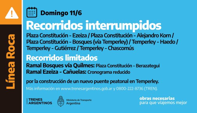 Las formaciones que unen Plaza Constitución con las estaciones de Ezeiza, Alejandro Korn y Bosques vía Temperley no circularán durante el domingo 11 de junio, como consecuencia de la construcción del nuevo puente peatonal de la estación Temperley.