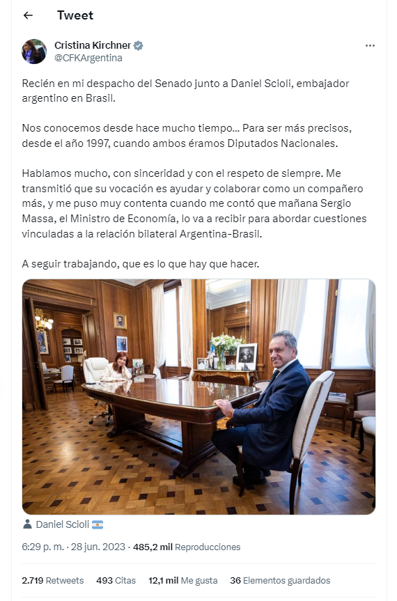 La vicepresidenta Cristina Fernández de Kirchner recibió en su despacho del Senado al embajador en Brasil, Daniel Scioli, con quien habló durante cerca de una hora y media “con sinceridad y el respeto de siempre”.