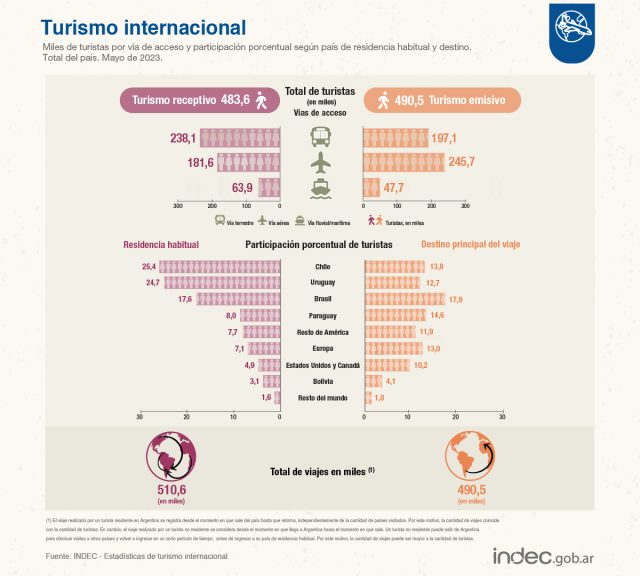 De acuerdo a los datos difundidos hoy, en mayo de 2023, ingresaron 992.500 visitantes no residentes por todas las vías de acceso a la Argentina, de las cuales 483.600 fueron turistas y 509.000 fueron excursionistas.