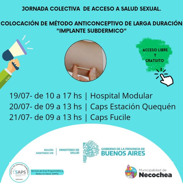En el marco de garantizar el acceso a Derechos Sexuales, Salud Comunitaria y el Programa de Salud Sexual y (no) Reproductiva de la Región Sanitaria VIII, el Hospital Dr. Domingo Taraborelli, junto a promotores de Salud y la Dirección de Atención Primaria municipal, los días 19, 20 y 21 de julio se realizará una campaña de acceso a la “Colocación de Método Anticonceptivo de Larga Duración”.