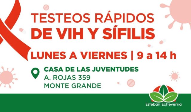 De lunes a viernes, de 9 a 14 horas, vecinas y vecinos mayores de 13 años pueden acceder al test rápido, gratuito, voluntario y confidencial de VIH y sífilis que el área de Salud del Municipio de Esteban Echeverría realiza en la Casa de las Juventudes, ubicada en Rojas 359, de Monte Grande.