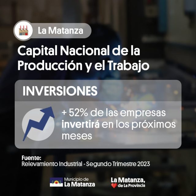 El relevamiento realizado por el Observatorio de Ventas, Producción y Empleo de La Matanza sostiene que el 73% de las empresas aumentó su actividad o la mantuvo, respecto al segundo trimestre del 2022. A su vez, un 52% de las industrias prevé invertir en los próximos meses, un 45% ya realizó inversiones en lo que va del año, lo que denota un mantenimiento de la actividad sobre un buen nivel de la misma. Cabe destacar que el 98% de los empresarios que realizaron inversiones sostuvieron o aumentaron su personal de planta.