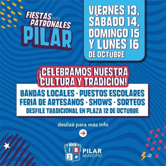 Asimismo, según adelantaron desde el área de Cultura del Municipio de Pilar, el lunes 16 (feriado por el Día del Respeto a la Diversidad Cultural) se desarrollará en la Plaza 12 de Octubre (Rivadavia e Hipólito Yrigoyen, Pilar) el tradicional desfile que identifica a las Fiestas Patronales.