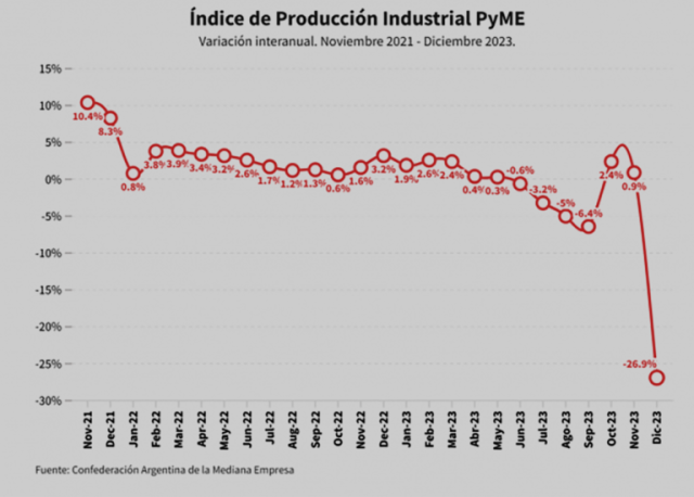 Según un informe dado a conocer por la Confederación Argentina de la Mediana Empresa (CAME), la producción industrial manufacturera de las pequeñas y medianas empresas se derrumbó un 26,9% a precios constantes en el último mes de 2023 y cerró el año con una baja del 2,6%. A su vez, en la comparación diciembre contra noviembre, la actividad industrial sufrió una retracción abrupta del 31,7%.
